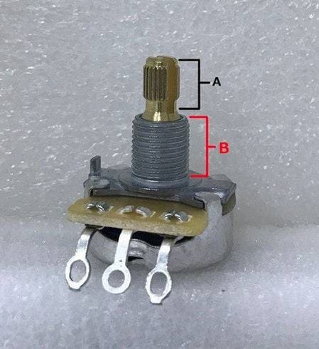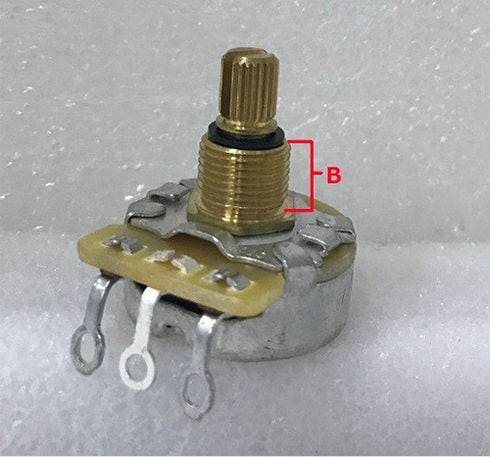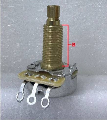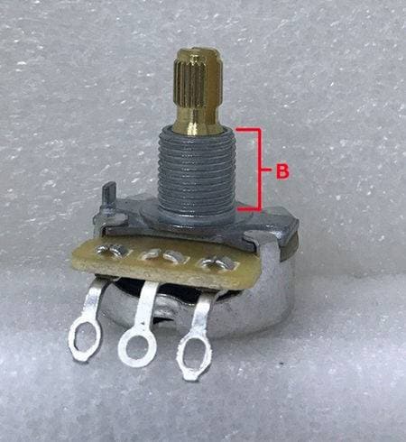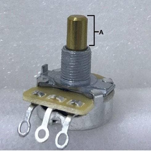 ポット本体底面がくぼんでいることから「へそ付き」とも呼ばれます。高さは、約6mmほどで、主にFENDER系の製品に純正採用されているスペックとなり、ピックガードやコントロールプレートなどの薄い物へ搭載するとちょうど良い高さになる仕様です。